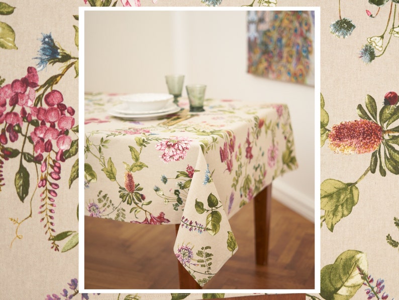 Elegant Botanical Print: Lush summer florals on a soft linen-inspired background create a cheerful yet refined atmosphere for your dining space.